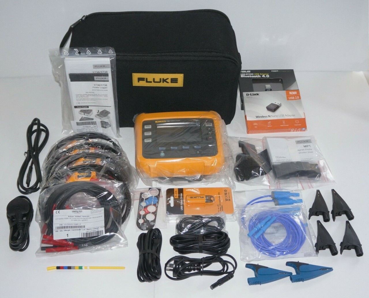Fluke 1738 Three Phase Portable Power Logger, Flexible current probes (i173x-Flex), Voltage test leads and alligator clips, USB cable, Ethernet cable, Wi-Fi adapter (if applicable), SD memory card, Power supply and international adapter set, Soft carrying case, Fluke Energy Analyze Plus software (downloadable), User manual and quick-start guide, Calibration certificate (if applicable), Safety and compliance documentation, Manufacturer warranty card, Original Fluke packaging