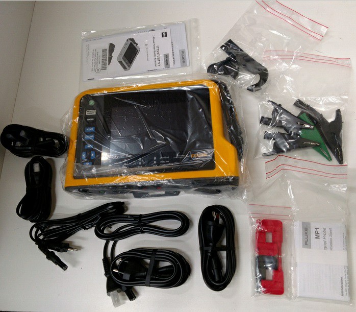 Fluke 1775 Three Phase Power Quality Analyzer, Voltage test leads, Current clamps (iFlex or standard), AC adapter or power cord, USB communication cable, SD memory card, Carrying case, User manual and quick-start guide, Fluke PowerLog software (CD or download link), Calibration certificate, Safety and compliance documentation, Manufacturer warranty card, Original Fluke packaging