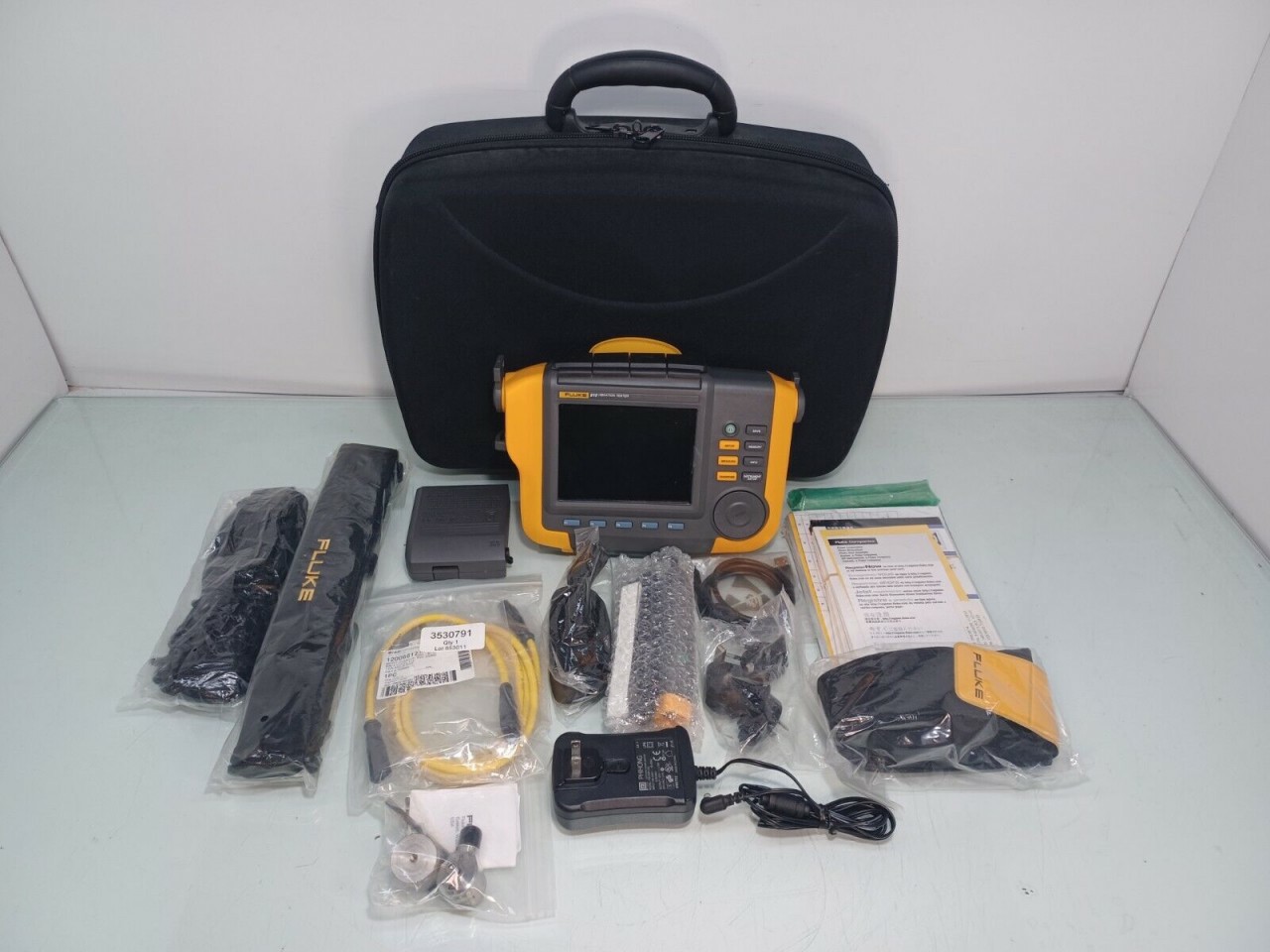Fluke 810 Mechanical Vibration Tester, Triaxial accelerometer sensor, Mounting accessories (magnet, adhesive), Laser tachometer with reflective tape, USB cable, Power adapter and battery charger, Rechargeable battery pack (pre-installed), Carrying case, Fluke Viewer PC software (CD or download), User manual and quick-start guide, Calibration certificate (if provided), Manufacturer warranty card, Original Fluke packaging