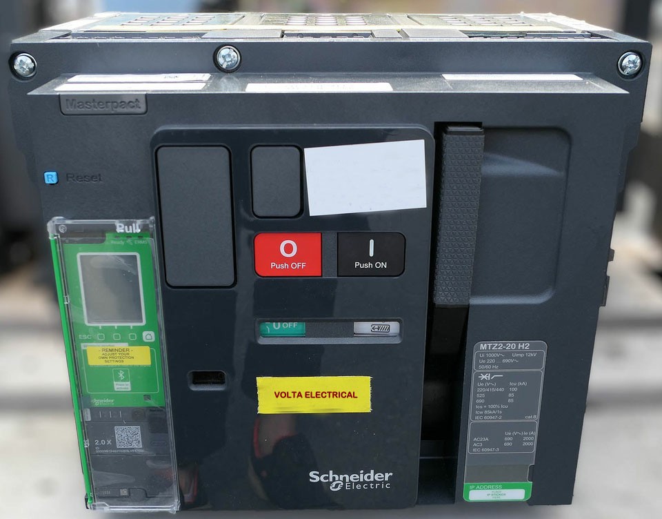 Schneider Electric MTZ2 20 H2 2000A 3 Pole Air Circuit Breaker, Micrologic X trip unit (digital and connected), Manual or motorized operating mechanism, 3-pole configuration, Line and load terminal connections, Fixed or drawout cradle (if applicable), Communication module (if equipped), Control wiring harness, Mounting hardware, Test or calibration certificate (if applicable), User manual and installation guide, Safety and compliance documentation, Manufacturer warranty card, Original Schneider Electric packaging