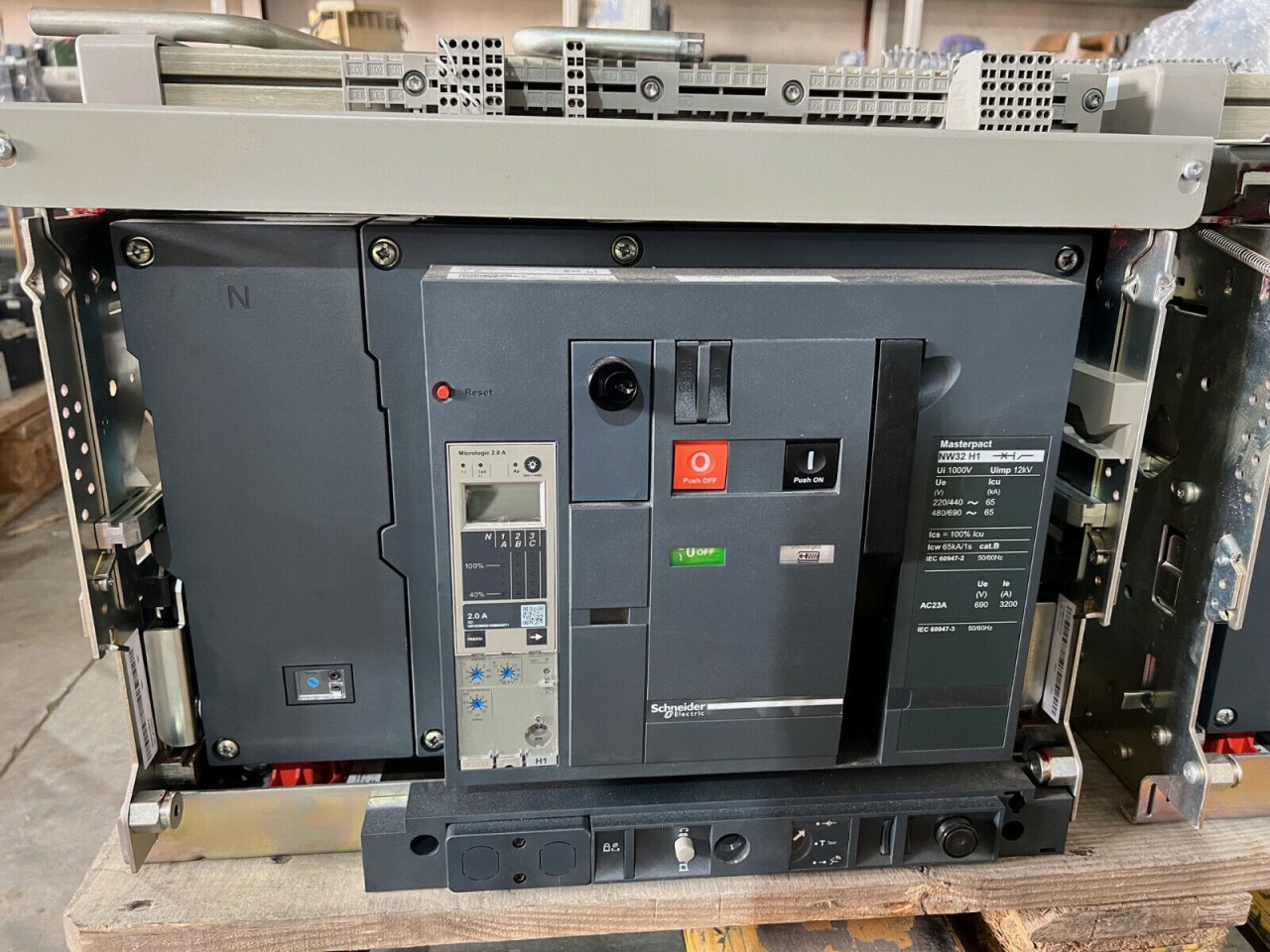 Schneider Masterpact NW32 H1 3200A Air Circuit Breaker, Micrologic trip unit (e.g. Micrologic 5.0, 6.0, or 7.0), Line and load terminals, Manual or motorized operating mechanism, Fixed or drawout cradle (if applicable), Control wiring and terminal blocks, Mounting hardware, Test or calibration certificate (if applicable), Communication module (if equipped), User manual and installation guide, Safety and compliance documentation, Manufacturer warranty card, Original Schneider Electric packaging